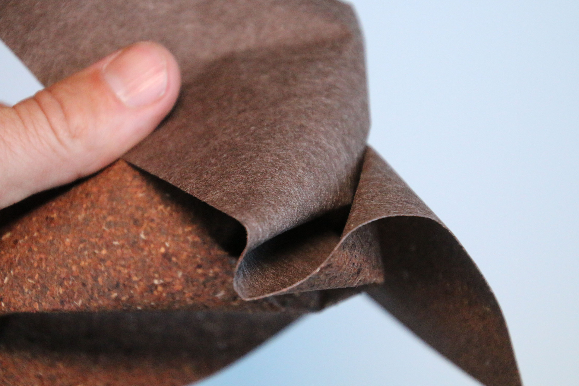 Veganes Leder aus Kaffeepulver, das nicht mehr als Lebensmittel eingesetzt werden kann und trotzdem den typischen anregenden Kaffeeduft verströmt - auf einem dünnen, flexiblem Trägermaterial. Der Duft des Kaffeepulvers steigt sofort in die Nase.